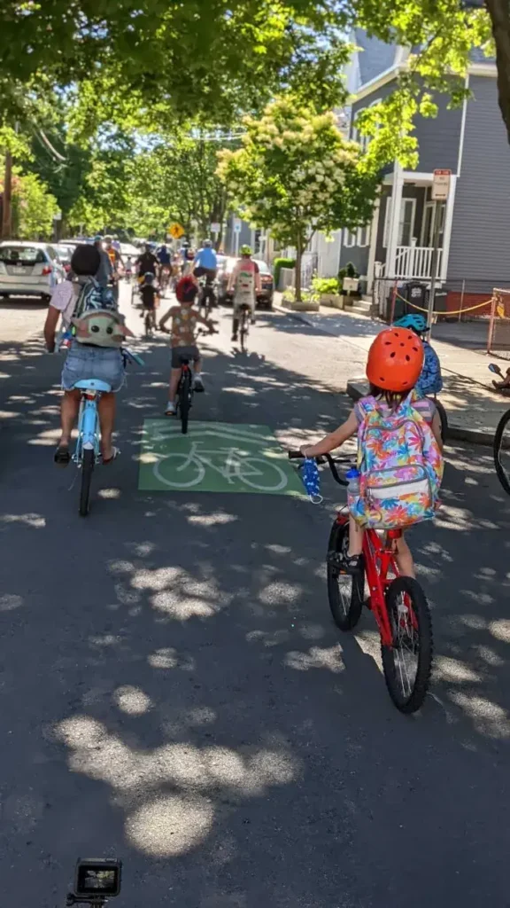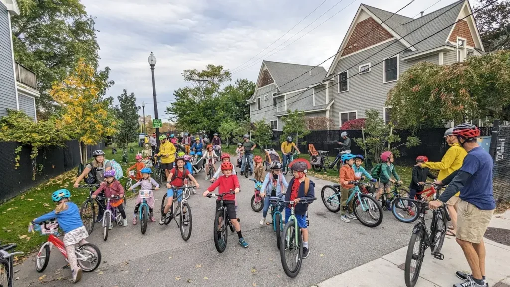 A bike bus is a group of parents and children riding their bikes to school together, led by volunteer marshals to help with logistics and traffic management. The ride is typically short, under one mile, and fosters a fun, safe, and social way to get to school. Cambridge Bicycle Safety organizes bike bus rides to several neighborhood schools throughout the year.